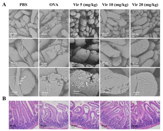 While the jejunum villi were regularly arranged without fracture on the surface of the jejunum villi in the PBS group, they were severely damaged in the OVA group. As expected, the damaged jejunum villi were repaired to different degrees following treatments with viridicatol (Figure 4A). In parallel with the clinical assessment, there were obvious signs of inflammation, including serious lymphocytic infiltration using hematoxylin and eosin (H&E). These symptoms were relieved following treatments with viridicatol (Figure 4B).