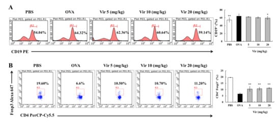 Effects of viridicatol on the population of B cells and regulatory T cells (Tregs) in the spleen. (A) Histograms of splenic B cells. Splenic lymphocytes were labeled with anti-CD3 and anti-CD4. (B) Scatter diagrams of regulatory T cells (Tregs). Splenic lymphocytes were labeled with anti-CD4 and anti-Foxp3. Spleens were isolated from each group of mice 24 h after the last challenge, labeled with various antibodies, and underwent Fluorescence Activating Cell Sorter (FACS) analysis by flow cytometry. * p < 0.05, ** p < 0.01 compared with the OVA group. The data represent the mean ± SD. Vir: viridicatol.