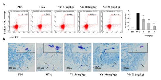 Effects of viridicatol on the mast cell (MC) population and degranulation. (A) Scatter diagrams of MCs and FACS analysis by flow cytometry. Splenic lymphocytes were labeled with anti-c-kit and anti-FcεR Iα. (B) Representative toluidine blue-stained jejunum sections (magnification: 400×). Jejunum tissues were isolated from each group of mice 24 h after the last challenge and fixed in paraformaldehyde. ** p < 0.01 compared with the OVA group. The data represent the mean ± SD. Vir: viridicatol.
