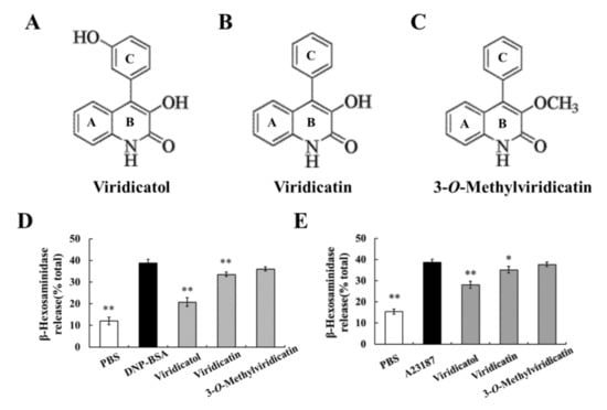 Viridicatol and its homologs for the chemical structural, and the inhibitory effect on RBL-2H3 cells. (A) The chemical structure of viridicatol. (B) The chemical structure of viridicatin. (C) The chemical structure of 3-O-methylviridicatin. (D) Effects of viridicatol and its homologs on IgE-induced degranulation. Same as Figure 1C, except that viridicatol was replaced by its homologs at 10 μg/mL. (E) Effects of viridicatol and its homologs on A23187-induced degranulation. Same as Figure 7B, except that viridicatol was replaced by its homologs at 10 μg/mL. * p < 0.05, ** p < 0.01 compared with the DNP-BSA or A23187 groups. The data represent the mean ± SD of three repeated experiments. Vir: viridicatol.
