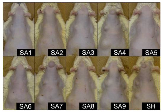 At 24 weeks, the substances injected intradermally were macroscopically detected in the skin of 10 rats (one in SA1, one in SA2, one in SA3, two in SA4, one in SA5, two in SA6, and two in SA7) (Figure 1). However, almost all the rats with intradermal injection of SA showed a skin bulge due to the subcutaneous substances, suggesting that a major proportion of the substance injected intradermally was leaked into the subcutis. No changes were observed in the other injection sites except for bulging. No macroscopic change was observed in any of the injection sites with PBS.