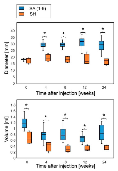 Some rats had a habit of rubbing the crown against the wall, and the shape change of the substance injected on the periosteum varied greatly among individuals. It was difficult to constantly inject 0.1 mL of filler into the thin skin of rats intradermally and examination of the removed specimens revealed that many individuals had the injected substance leaked subcutaneously. Therefore, further evaluation was performed using only the results of subcutaneous injection. When the SA samples were analyzed as one group, SA showed higher volume expansion efficiency than SH, and both the diameters and volumes of SA were significantly larger than those of SH at all time points during the observation period (Figure 2).