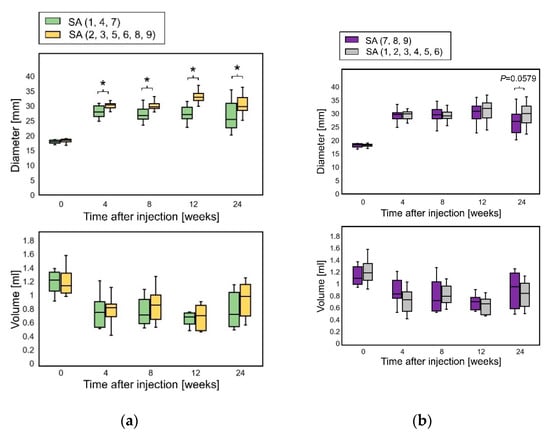 Diameter and volume of subcutaneously injected SA. (a) Comparison between SA with a low M/G ratio (SA1, SA4, and SA7) and the other SA types. Diameters at 4 weeks, p = 0.00531; diameters at 8 weeks, p = 0.00238; diameters at 12 weeks; p = 0.00000539; diameters at 24 weeks, p = 0.0197 (Mann–Whitney U-test). *, significant difference (p < 0.05). SA: sodium alginate, SH, sodium hyaluronate. (b) Comparison between SA with high viscosity (SA7, SA8 and SA9) and the other SA types. Diameters at 24 weeks, p = 0.0579 (Mann–Whitney U-test). SA: sodium alginate.