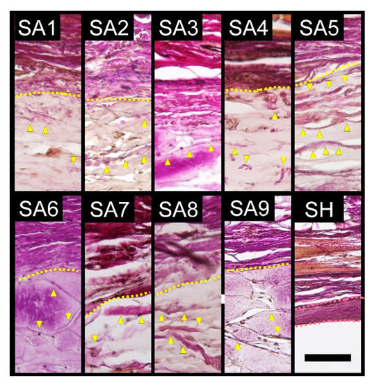 Representative Elastica van Gieson-stained sections at 24 weeks of subcutaneously injected SA or SH. Unlike SH, all the sodium alginate types did not form a capsule around the substance. Instead, collagen fibers were deposited within the substance (yellow arrow heads). The interrupted yellow lines indicate the boundaries between the SA substance and surrounding tissue. The area between the red dotted lines indicate capsule formation surrounding the SH substance. SA: sodium alginate, SH, sodium hyaluronate. Scale bars = 100 µm.