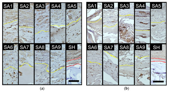 Representative images of immunostained sections for macrophages (Galectin 3). The dotted yellow lines indicate the boundaries between the test substance and surrounding tissue. The area between the red dotted lines indicates capsule formation surrounding SA. SA: sodium alginate, SH, sodium hyaluronate. Scale bars = 100 µm. (a) Four weeks after injection. Numerous macrophages aggregated around the SA substance and infiltrated into it, indicating granulomatous reactions. Macrophages also aggregated around the SH substance, but the number was relatively small. (b) Twenty-four weeks after injection. The numbers of macrophages were significantly lower (especially in SH) than those at 4 weeks. Some sustained granulomatous reactions were observed in SA1 and SA4.