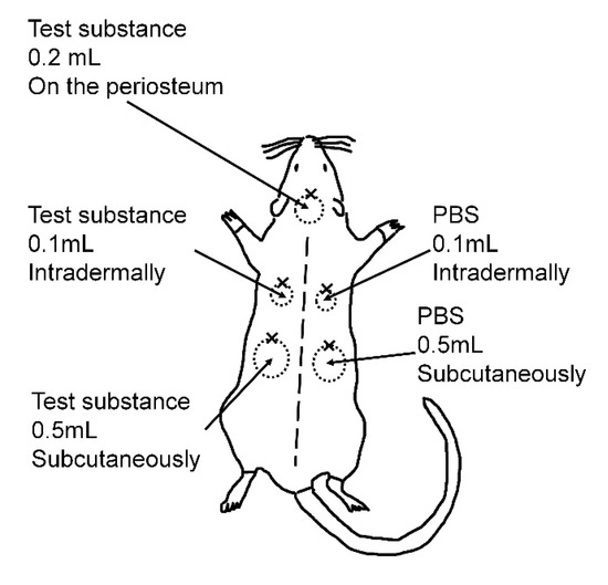 The injections were performed under general anesthesia with isoflurane inhalation. The hairs on the back were shaved using hair clippers, followed by hair removal with a depilatory cream (Epilat; Kracie Pharma, Tokyo, Japan). Each test substance was injected onto the parietal periosteum (0.2 mL), intradermally in the left scapular area (0.1 mL), and subcutaneously in the left lumbar area (0.5 mL) (Figure 6). As a negative control, the same volumes of phosphate-buffered saline (PBS) were injected on the right side in the same manner. A 1-mL Luer-lock syringe (TOP Corporation, Tokyo, Japan) with a 30-gauge needle (NIPRO Corporation, Osaka, Japan) was used to inject the test substance. A 6-0 nylon thread was used to make a landmark of each injection site. The rats were maintained under a 12-h day/night cycle and were fed standard feed with water ad libitum. At the end of each experimental period (4 weeks, short-term experiment; 24 weeks, long-term experiment), the rats were euthanized by anesthetic overdose. Assuming clinical use, the injections were given to three different layers and the injection volumes were determined as the minimum amount, with which the swelling could be confirmed at each layer: 0.2 mL on the periosteum, 0.1 mL intradermally, and 0.5 mL subcutaneously.