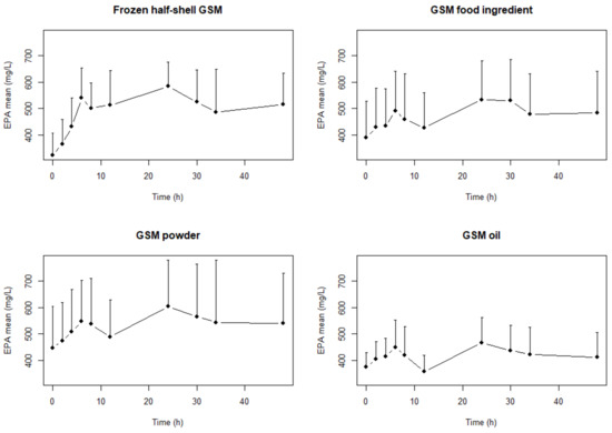 The CMax0–12h and CMax0–48h were significantly (p = 0.011, f = 5.05 and p = 0.004, f = 6.39, respectively) higher in the EPA of the GSM half-shell compared with GSM food ingredient and GSM oil over both time periods. Further, the CMax0–12h and CMax0–48h of the GSM powder were significantly different (p = 0.011, f = 5.05 and p = 0.004, f = 6.39, respectively) between the GSM powder and the GSM oil. italic.