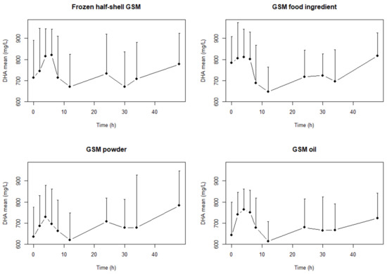 The TMax0–48h was significantly (p = 0.04) lower (5 h) in the GSM oil than the other three formats (in the 24–27 range) but this was not evident in the shorter TMax0–12h period. Two peaks are identified (Figure 1, Figure 2 and Figure 3) in the concentration-time profiles which led to two time periods analyzed for maximum measured plasma concentration (0–12 h and 12–48 h). There were no statistical differences determined in the TMax0–12h and TMax0–48h in EPA and DHA concentrations during the study.