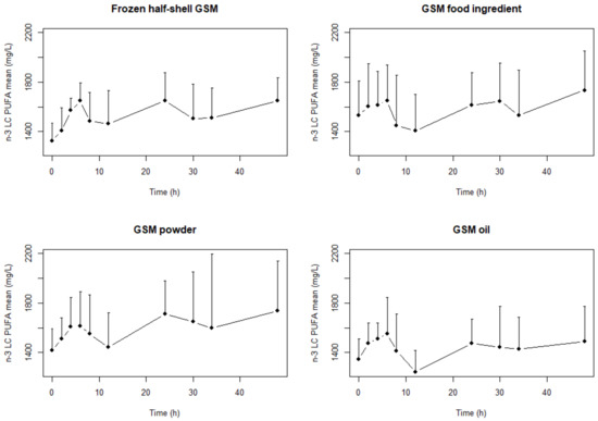 The bioavailability and pharmacokinetics (PK) of a drug are key determinant factors in the ultimate manifestation of efficacy in clinical practice. The same applies to bioactives from natural sources that deliver health benefits such as n-3 LC PUFA. Critically important parameters are the CMax (Maximum measured plasma concentration from time), TMax (Time of the maximum measured plasma concentration), elimination t½ and AUC (incremental area under the plasma concentration-time curve) data after single and multiple doses, which are used to determine optimum dosing regimens. Various biomarkers (such as EPA and DHA) have been used in recent studies on the bioavailability of n-3 LC PUFA, but their effectiveness has not been systematically compared nor has their use been fully justified [10,11,19,28,29,30]. In addition, there is growing evidence that the bioavailability of n-3 LC PUFAs varies depending upon their derived sources, such as krill oil, fish oil, mussel or algal oils [10,11,12], and is further dependent on the fat composition and content of the diet and the food preparation methods employed [10,31]. This is due to the food structure or format of the n-3 LC PUFAs of the difference sources. The difference in the bioavailability of n-3 LC PUFAs when eaten as food product, functional food, freeze dried powder and/or extracted oil is yet to be established and we hypothesize that it may differ as food structure and therefore digestion may be affected by format. In this paper, pharmacokinetic parameters to determine bioavailability (CMax, TMax and AUC) of n-3 LC PUFA were measured for different formats of GSM following single dose intakes, as a first step in gaining a better understanding of the pharmacokinetics of key active ingredients.
