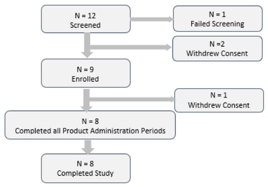 Following screening procedures, eligible subjects were enrolled into the study and completed four administration periods at the CCST research unit. A total of twelve subjects were screened for the study. One subject failed screening based on an exclusionary BMI. Two further subjects met eligibility criteria at screening but subsequently withdrew consent prior to study enrolment (Figure 4). For each subject, product administration order was determined by randomized allocation to one of four Test Product sequences. Nine subjects were randomized into the study. This included one subject who withdrew consent prior to Administration Period 2; a replacement subject was randomized into the study, to ensure eight evaluable subjects.