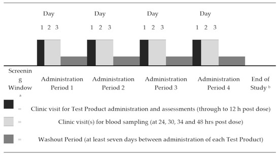Each administration period comprised a long clinic visit (from approximately 1½ h prior to product administration through until completion of 12-h post-administration assessments) and several short visits.