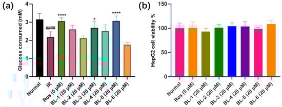 BLs influenced glucose consumed in IR HepG2 cell without inhibiting cell viability at designated concentration. (a) Glucose consumed. (b) HepG2 cell viability. #### p < 0.0001 vs. Normal, * p < 0.05 vs. IR, **** p < 0.0001 vs. IR. Mean ± SD (n = 6).