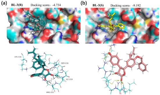 Interaction modes of (a) BL-3(R) and (b) BL-3(S) with PTP1B. Hydrogen bonds with residues are represented by dashed lines.