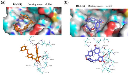 Interaction modes of (a) BL-5(R) and (b) BL-5(S) with PTP1B. Hydrogen bonds with residues are represented by dashed lines.