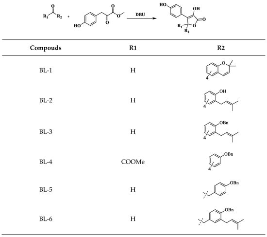 At 0 °C, 2-oxo-3-phenylpropionic acid methyl ester (5.27 mmol) and the appropriate carbonyl compound (1.3 equivalents, 6.85 mmol) were added into dry DMF (24 mL). After cooling to 0 °C, DBU (0.80 mL, 5.35 mmol) was added dropwise, the reaction was stirred at 0 °C for 3–5 h, and then poured into hydrogen chloride (HCl, 1mol/L, 50 mL). The organic layer was separated, and the aqueous layer was extracted with EA. The organic layers were combined, dried over Na2SO4 and concentrated in vacuo, and then purified with column chromatography (mobile phase of EA-PE, 2:1, v/v) to obtain BL-1–BL-6. The purity of each compound was ≥98.0% by peak area normalization of high-performance liquid chromatography.