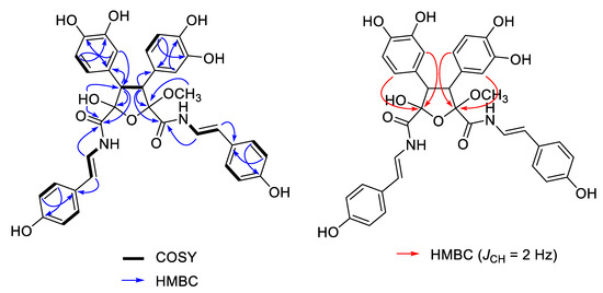 Selected 2D NMR correlations for suberitamide A (1). HMBC (heteronuclear multiple bond correlation) experiments were optimized for JCH = 8.0 Hz (blue arrows, measured in DMSO-d6) or JCH = 2.0 Hz (red arrows, measured in CD3OD).