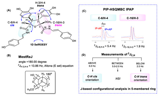 (A) Selective 1D ROESY correlations around the five-membered ring in 1. (B) calculated proton–proton coupling when the H-3/H-4 dihedral angle is 180°. (C) 8.0 Hz optimized PIP-HSQMBC IPAP (pure in-phase heteronuclear single quantum multiple bond correlation in-phase and anti-phase) spectra were acquired. The in-phase plus anti-phase (IP + AP) and in-phase minus anti-phase (IP − AP) datasets were processed and corresponding 1D slices (blue, IP + AP; red, IP − AP) were overlaid at the C-3, C-4, C-6, and C-16 carbon chemical shifts. (D) flow chart to use 3JC,H values for configurational analysis of five-membered oxolane ring (NSI: no stereochemical information can be extracted) [14,15].
