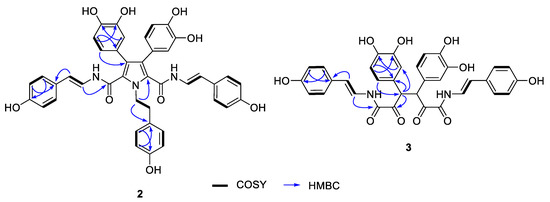Selected 2D NMR correlations for suberitamides B (2) and C (3).