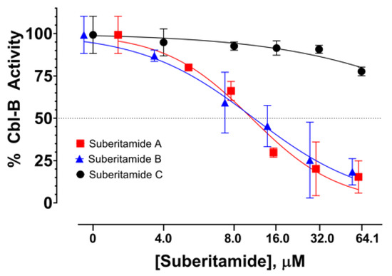 Dose-response curves of Cbl-b inhibitory activity for suberitamides A–C (1–3).