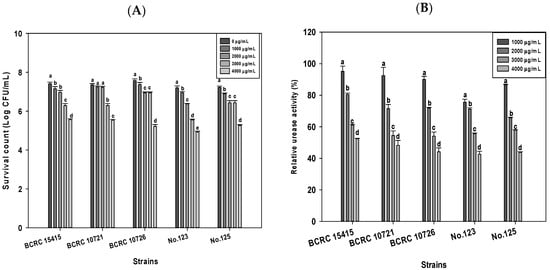 The survival (%) 1 of H. pylori BCRC10726, No.123, No.125 in serum-BHIB 2 (pH 2.0–8.0) with/without chitosan (4000 μg/mL) and incubated micro-aerobically at 37 °C for 6 h.
