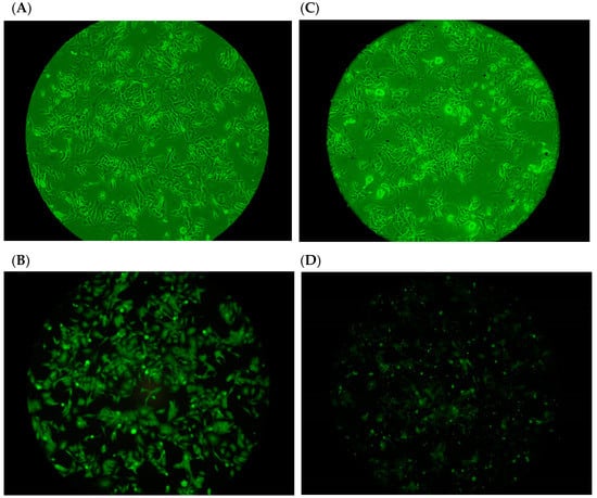 Effect of chitosan on the adhesion of H. pylori BCRC 17026 to TSGH cell line. (A) control, bright-field microscopic observation; (B) control, fluorescent microscopic observation; (C) chitosan (200 μg/mL) treatment, bright-field microscopic observation; (D) chitosan (200 μg/mL) treatment, fluorescent microscopic observation.
