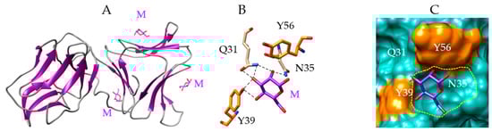 The Grateloupia chiangii lectin (GCL) offers a nice example of a Man-specific red alga lectin with a β-prism II structure. The β-prism II scaffold consists of three bundles of four antiparallel β-strands arranged into a flattened trefoil-shaped structure around a central pseudoaxis. The GCL lectin dimer consists of two covalently linked swapped protomers organized in a β-trefoil in such a way that both protomers become oriented almost orthogonally (Figure 2A). Each protomer contains three carbohydrate-binding sites (CBS-I, CBS-II, and CBS-III) that form a shallow depression which accommodates a Man residue via a network of six hydrogen bonds involving Q31, N35, Y39 residues, and stacking interactions between the aromatic residues Y39 and Y56 and the pyranose ring of mannose (CBS-I) (Figure 2B,C). The green algae group, Boodlea coacta, also contains a Man-specific lectin (BCA) with a β-prism II structure [].