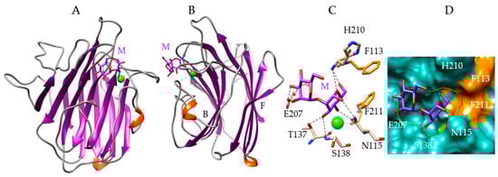 The Porphyra umbilicalis lectin (PUL) illustrates the β-sandwich organization of the lectin protomer, resulting from the covalent superposition of two strands of β-sheets connected by more or less extended loops, forming the front and back faces of the β-sandwich, respectively (Figure 3A,B). This type of structural organization is very common in plant lectins belonging to the Fabaceae or Leguminosae family, such as Con A [], pea [], and lentil [] lectins. Animal lectins, such as the LMAN1/ERGIC-53 protein [] or the VIP36 protein [], also possess a β-sandwich structure. A few amino acid residues belonging to the loops connecting both strands of β-sheets in the β-sandwich structure (Figure 3B), form the CBS which accommodates Man and dimannosides via a network of hydrogen bonds with residues N115, T137, S138, E207 and H210, and stacking interactions with the aromatic residues F211 and F213 (Figure 3C). The CBS appears as a shallow depression at the molecular surface of the lectin, in which the Man units become anchored (Figure 3D). Two other Man-specific lectins with a β-sandwich structure have been identified in the green-yellow alga Nannochloropsis gaditana (BU14), and in the green alga Ostreococcus tauri (OtL) [] (Table 1).
