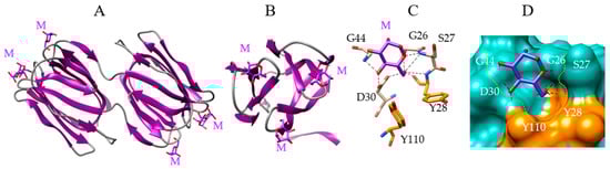 Molecular modeling of griffithsin. (A,B) Lateral (A) and front view (B) of the ribbon diagram of the domain-swapped griffithsin, in complex with mannose (M) (PDB code 2GUD). (C) Network of hydrogen bonds (black dashed lines) anchoring mannose (M) to the amino acid residues forming the CBS of griffithsin. Aromatic residues Y28 and Y110 participating in stacking interactions with the pyranose ring of Man, are colored orange. (D) Molecular surface (colored slate green) at the CBS of griffithsin forming a depression (delineated by a yellow dashed line) harboring the Man (M, colored purple) linked by a network of hydrogen bonds (black dashed lines) to G26, S27, Y28, D30, and G44 residues, and stacking interactions with Y28 and Y110 residues (colored orange).