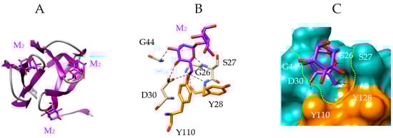 Molecular modeling of griffithsin. (A) Front view of the ribbon diagram of a domain of griffithsin, in complex with dimannoside Manα1,6Man (M, colored purple) (PDB code 2HYQ). (B) Network of hydrogen bonds (black dashed lines) anchoring the dimannoside (M) to the amino acid residues forming the CBS of griffithsin. Aromatic residues Y28 and Y110 participating in stacking interactions with the dimannoside, are colored orange. (C) Molecular surface (colored slate green) at the CBS of griffithsin forming a depression (delineated by a yellow dashed line) harboring the dimannoside (M, colored purple) linked by a network of hydrogen bonds (black dashed lines) to G26, S27, Y28, D30 and G44 residues, and stacking interactions with Y28 and Y110 residues (colored orange). Note the absence of contact between the second Man residue of the dimannoside and the CBS of griffithsin.
