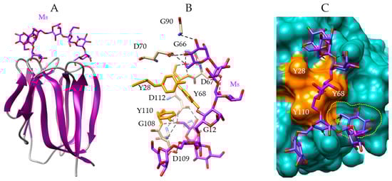 Molecular modeling of lectin from Grateloupia chiangii. (A) Lateral view of the ribbon diagram of the modeled lectin from Grateloupia chiangii (GCL), in complex with mannose (M, colored purple). The lectin dimer consists of the association of two differently oriented protomers exhibiting a β-trefoil fold. Man residues occupying the three CBS of the second protomer are represented. (B) Network of hydrogen bonds (black dashed lines) anchoring Man (M) to the amino acid residues Q31, N35, and Y39, forming the CBS-I of GCL. Aromatic residues Y39 and Y56 participating in stacking interactions with the pyranose ring of Man, are colored orange. (C) Molecular surface (colored slate green) at the CBS-I of GCL, forming a depression (delineated by a yellow dashed line) harboring the Man (M, colored purple) linked by a network of hydrogen bonds (black dashed lines) to Q31, N35, and Y39 residues, and stacking interactions with Y39 and Y56 residues (colored orange).