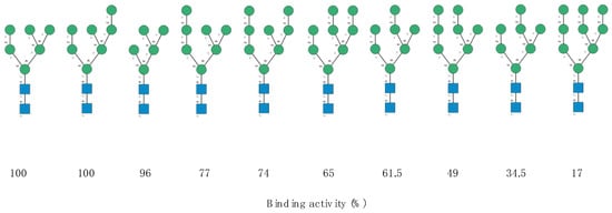 The carbohydrate-binding specificity of another Man-specific lectin with a β-prism I structure from the red alga Kappaphycus alvarezii (KAA-2) towards high-mannose glycans, has been studied in detail by Sato et al. []. The high-mannose glycan-binding activity of the lectin was measured towards a series of bi- and tri-antennary branched high-mannose glycans (Figure 7).