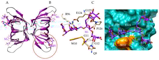 Docking of a pentamannoside (Man5) to the modeled KAA-2 lectin, showed the existence of four CBS located at both ends of the β-barrel forming each protomer of the KAA-2 dimer (Figure 8A). The CBS accommodates the pentamannoside via a network of 14 hydrogen bonds with Q9, G11, G12, R96, E124, G125 and P126 residues, completed by an additional stacking interaction with the aromatic W10 residue (Figure 8B,C). All the Man units of M5 participate in the binding to the lectin.