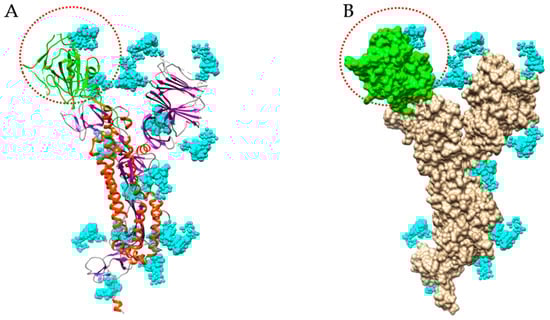 Structure of S-glycoprotein of SARS-CoV-2. (A) Ribbon diagram of the heavily glycosylated S-glycoprotein of SARS-CoV-2 (PDB code 6VXX). The RBD bearing 2 N-glycans is colored green and circled by a red dotted line. N-glycans (biantennary core (GlcNAc)2(Man)5) are colored cyan. (B) Molecular surface representation of the glycosylated S-glycoprotein of SARS-CoV-2. The molecular surface of RBD is colored green.