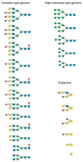 Figure 10. Diversity of the N-glycans of the biantennary complex type (left frame) and high-mannose type (upper right frame), and O-glycans (lower right frame), identified in the S-glycoprotein forming the spikes at the surface of the SARS-CoV-2 envelope []. Symbols used to represent the N- and O-glycans: blue squares: N-acetylglucosamine (GlcNAc), green circles: mannose (Man), yellow circles: galactose (Gal), red triangle: fucose (Fuc), purple diamonds: sialic acid (Neu5Ac), yellow square: N-acetylgalactosamine (GalNAc). - -