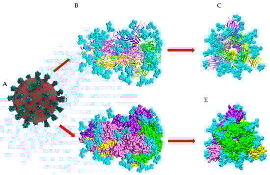 Surface glycosylation of SARS-CoV-2 virus. (A) Overall structure of SARS-CoV-2 showing the spikes (colored green) arrayed on the surface of the virus (Coronavirus Credit: Maria Voigt/RCSB PDB). (B,D) Sagital views of the ribbon diagram (B) and the molecular surface (D), showing the structural organization of the spike (PDB code 6ZGE). The three S-glycoproteins forming the SARS-CoV-2 spike are colored yellow, pink, and purple, respectively. The RBD in each S-glycoprotein is colored green. (C,E) Front views of the ribbon diagram (C) and the molecular surface (E), showing the structural organization of the spike. N-glycan chains occupying the putative N-glycosylation sites in the three S-glycoproteins, are colored cyan and represented in spheres.
