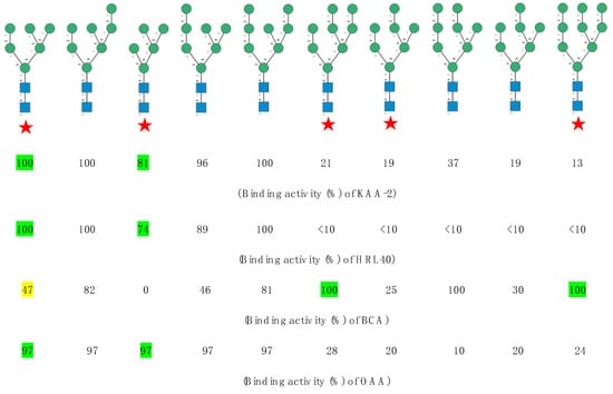 Comparative analysis of the binding activity (expressed as %) of the Man-specific lectins KAA-2 from Kappaphycus alvarezii, HLR-40 from Halimeda renschii, BCA from the green alga Boodlea coacta, and OAA from the blue-green alga (cyanobacterium) OAA from Oscillatoria agardhii (adapted from Mu et al. [] and Sato et al. [,]). Symbols used to represent high-mannose glycans: blue squares: N-acetylglucosamine, green circles: mannose. High-mannose glycans identified in the S-glycoprotein of the SARS-CoV-2 are indicated by a red star.