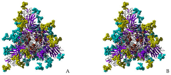 Glycosylation of trimeric S-glycoprotein of SARS-CoV-2. (A) Front view of the trimeric S-glycoprotein of SARS-CoV-2 showing the high-mannose type glycans (colored yellow) specifically recognized by Man-specific lectins KAA-2 and HRL-40 from the red algae Kappaphycus alvarezii [,] and Halimeda renschii [], and OAA from the blue-green alga (cyanobacterium) Oscillatoria agarddhii []. Other complex N-glycans decorating the monomer weakly or not recognized by the lectins, are colored cyan. (B) Front view of the trimeric S-glycoprotein of SARS-CoV-2 showing the high-mannose type glycans (colored yellow) specifically recognized by the Manα1,2-specific lectin BCA from the green alga Boodlea coacta []. Other complex N-glycans decorating the monomer weakly or not recognized by BCA, are colored cyan.