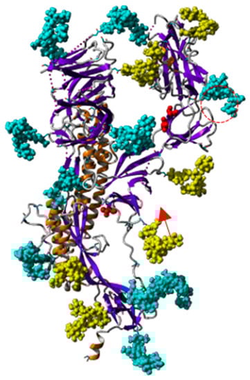 Ribbon diagram of the monomeric S-glycoprotein of SARS-CoV-2 showing the buried character of the O-glycosylated T323 and S325 amino acid residues (red dashed circle). High-mannose type glycans recognized by Man-specific seaweed lectins are colored yellow. Another exposed O-glycosylated T678 occurs in the S-glycoprotein (red arrow). Other often sialylated complex type N-glycans, well exposed at the surface of the S-glycoprotein monomer, are colored blue.