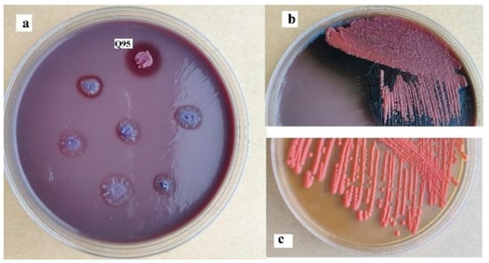 As a variety of mangrove plants are rich in tannins, mangrove-derived microorganisms are expected to induce tannase with good properties [26]. Sixty-four yeast strains isolated from mangrove samples were first purified and then inoculated on YPT (Yeast extract-Peptone-Tannic acid) plates at a pH of 4.5. Upon the transformation of tannic acid in the plates into gallic acid, the corresponding part showed a different color from that containing the original tannic acid. The size of the circle around the strain can act as a relative index for the evaluation of the degradation ability toward tannic acid [3,4,5,6]. As shown in Figure 1a, strain Q95 led to the biggest circle on the plate, indicating that the tannase secreted from it had the highest activity. As for the streak cultivation on the YPT plate (pH = 3.0), strain Q95 corresponded to the part with more obvious color change (Figure 1b,c).