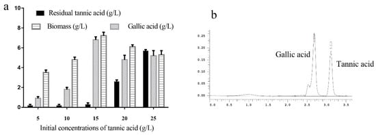 (a) Tannic acid degradation analysis of Q95 under the conditions of different tannin acid concentrations. (b) HPLC analysis of the substrate solution after tannase hydrolysis.