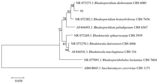 The colony of strain Q95 on the YPD plate was light red with smooth edges (Figure 1c). Observed under a microscope, the strain was found to have the characteristics of yeast. Besides, the cells were oval, with individual ones budding at one end (data not shown). Further, the ITS (Internal transcribed space)) rDNA of strain Q95 was sequenced to identify the strain, after which the sequence comparison was conducted with BLAST (Basic local alignment search tool). It was found that the ITS rDNA sequence (Accssion: MW173231) had the highest similarity to that of the identified strain Rhodosporidium diobovatum Q95. However, clustering analysis gave the information that the strain Q95 was on the same branch as Rhodosporidium (Figure 3). The BLAST results showed that the ITS rDNA sequence of strain Q95 had 97.8% identity to that of type strain Rhodosporidium diobovatum CBS 6085 (KY104768.1). Jointly verified by the BLAST and phylogenetic tree results, the strain Q95 was from the species Rhodosporidium diobovatum.