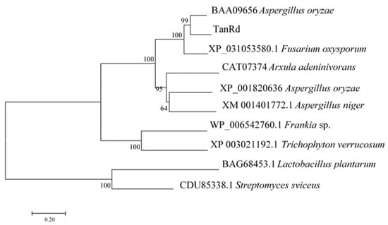 To clone the gene encoding TanRd, we sequenced the genome DNA of Q95. The sequence analysis showed that there existed a putative gene encoding TanRd, which was designated as TANRD (Submission ID: 2395723). The open reading frame (ORF) consisted of 1719 bp and encoded a protein composed of 572 amino acids. Further bioinformatics analysis was also performed. The results indicated that the first 19 amino acids of TanRd were predicted as the signal peptide, which was in conformity with the secretion characteristic. The signal peptide had a theoretical isoelectric point (pI) of 5.24 and the mature protein had a molecular weight (Mw) of 59.7 kDa. According to BLAST alignment on NCBI (National Center for Biotechnology Information), one conserved domain was found in TanRd, which belonged to the tannase and feruloyl esterase family [5,15,16,17,18]. To further explore the attribution of TanRd, a phylogenetic tree was constructed based on the amino acid sequences of it and other reported tannases. Figure 4 shows that the TanRd was a kind of fungal tannase, distinctly different from bacterial tannases [5]. TanRd was mostly close to TanA, a characterized tannase from Aspergillus oryzae [8]. In addition, TanRd was found to have the typical conserved “CS-D-HC motif” existing in the biochemically distinct members of the tannase family [15,16,17,18,27,28,29].