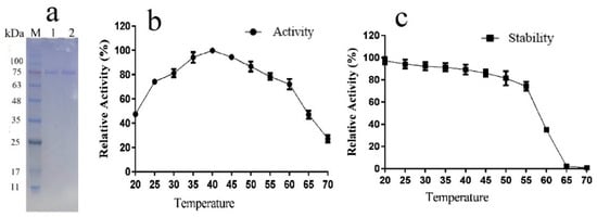 (a) Analysis of TanRd by SDS-PAGE. Lane M, pre-stained protein ladder; Lane 1 and lane 2purified TanRd. (b) Effect of temperature (°C) on the TanRd activity. (c) Effect of temperature (°C) on the TanRd stability. Data are expressed as mean ± standard deviation, n = 3.