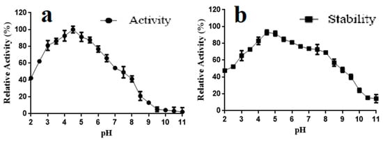 (a) Effect of pH on the TanRd activity. (b) Effect of pH on the TanRd stability. Data are expressed as mean ± standard deviation, n = 3.