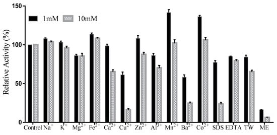 As indicated by Figure 7, metal ions at 1 mM did not exert a great inhibitory effect on the TanRd activity, except for Cu2+ and Ba2+ (Figure 7). The relative activity of TanRd was 141.5% and 136.2% in the presence of Mn2+ and Co2+, respectively. However, in the case of ME (2-hydroxy-1-ethanethiol) at 1 mM, the relative activity was remarkably reduced to 16.3%. This significant inhibition caused by ME has also been found in several reported tannases, the reason for which is the capability of ME to destroy the disulfide bonds in tannase structure. When the concentration was increased to 10 mM, the situation became different. The activity of TanRd was inhibited by Cu2+, Al3+, Ba2+, Ca2+, and SDS. It is worth noting that Mn2+ and Co2+ strongly promoted the activity. In short, TanRd possessed great metal ion tolerance and Mn2+ and Co2+ can be adopted as good activating agents for TanRd.