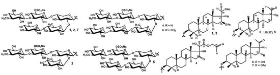 As result of our investigation, six unknown earlier triterpene glycosides were isolated from the sea cucumber Thyonidium (= Duasmodactyla) kurilensis. The glycosides have five different carbohydrate chains (kurilosides of the groups A, C–F), including three novel ones. The sulfated hexasaccharide moieties of kurilosides D (4) and F (6) are the third and fourth findings, correspondingly, in additional to the carbohydrate chains of the cladolosides of the groups K and L [11] of such type sugar parts in the sea cucumber glycosides. They all differ from each other in monosaccharide composition and the sulfate position. Pentasaccharide, branched by C(4)Xyl1, the chain of kuriloside E (5) with glucose as the second unit, is also unique. The oligosaccharide chains of the kurilosides of groups A and C, characterized by the same position of branching, were also found only in the glycosides from T. kurilensis. Five non-holostane aglycones without a lactone and with a 9(11) double bond were discovered in glycosides 1–7. Four of them have shortened side chains (22,23,24,25,26,27-hexa-nor-lanostane aglycones) and one aglycone (in kuriloside D (4)) was characterized by a normal side chain and has never been found earlier. It should also be noted that only in the glycosides from T. kurilensis were the substituents at C(16) with an α-orientation found, while all the other glycosides with a 16-O-acetic group were characterized by their β-orientation [14,15].