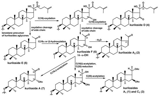 The biogenetic relationships of the aglycone parts of compounds 1–7 are presented in Figure 2. The precursor of the nor-lanostane aglycones is the derivative that has a normal side chain, with an oxygen-containing substituent at C(22), which is a necessary condition for the subsequent bond cleavage between 20 and 22 carbons with elimination of a side chain portion that leads to the formation of the 22,23,24,25,26,27-hexa-nor-lanostane (4,4,14-trimethyl-pregnane) aglycones without a lactone like in all glycosides of T. kurilensis, except for kuriloside D (4). In the process of forming of all the other aglycones of the kurilosides, side-chain cleavage occurs. The aglycone of kuriloside E (5) corresponds to this stage of biosynthesis. The introduction of an α-hydroxyl group to C(16) leads to the aglycone of kuriloside F (6). The introduction of a β-hydroxyl group to C(16) also occurs, but it quickly transformed to acetylated derivatives. The intermolecular dehydration of the 16-hydroxylated precursors leads to the aglycone of kuriloside A2 (2). The acetylation of the 16α-hydroxy-group resulted in the synthesis of the aglycone of kuriloside A (7). The enzymatic 16β-O-acetylation followed by the reduction of the 20-keto group, with subsequent acetylation of this position, leads to the aglycones of kurilosides A1 (1) and C1 (3).