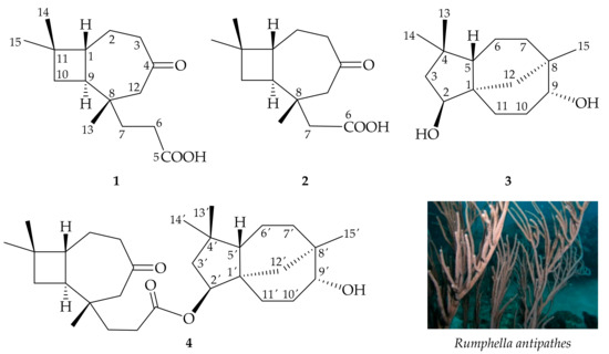 Rumphella (family Gorgoniidae) is a genus of soft coral consisting of four species, R. aggregata, R. antipathes, R. suffruticosa, and R. torta, the center of marine diversity of this genus being found in the Indo-Pacific Ocean. Corals were described by Shi-Zhen Li in his ancient herbal Compendium of Chinese Materia Medica, published in 1596, as “sweet, neutral and non-toxic; used to remove eye vision obstruction; clear abiding static blood; blow the powder to nose to stop nose bleeding; brighten the eye and calm the spirit; stop epileptic seizure; apply to the eye to improve floater.” Previous studies showed that the Rumphella genus exhibited extensive bioactivities, including antiproliferative [1], cytotoxic [2,3,4], antifungal [5], antibacterial [6,7,8,9], and anti-inflammatory [10,11,12,13,14,15,16,17,18] activities. Studies of the chemical constituents of octocorals of the Rumphella genus have led to the isolation of a series of compounds, including caryophyllanes [2,6,7,8,9,10,11,12,16,17,18,19,20,21,22], clovanes [13,14,15,23], steroids [3,4,5,24,25], glycerols [5], and fatty acids and lipids [25,26,27,28,29]. Our continuing studies of the constituents of the same extract from R. antipathes (Figure 1) resulted in the isolation of two novel caryophyllane-related sesquiterpenoids, antipacids A (1) and B (2), featuring a bicyclo[5.2.0] carbon core; a known sesquiterpenoid, clovane-2β,9α-diol (3); and rumphellolide L (4), an esterified product of 1 and 3 (Figure 1). This paper describes the isolation, structure determination, biosynthetic pathway analysis, and anti-inflammatory properties of sesquiterpenoids 1–4.