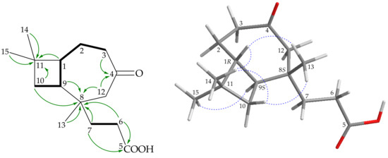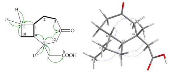 Antipacid B (2) was isolated as a colorless colloid that showed a sodiated adduct ion peak in (+)-HRESIMS at m/z 261.1468 [M + Na]+, which accounted for the molecular formula, C14H22O3 (calcd. for C14H22O3 + Na, 261.1467), with 4 degrees of unsaturation. The spectroscopic data of 2 resembled those of 1 (Table 1). The one-dimensional (1D) and two-dimensional (2D) NMR spectra revealed that the signals corresponding to the propanoic acid moiety in 1 were replaced by those of an acetic acid in 2 (Figure 3). Therefore, 2 was assigned as having a structure with the same stereochemistry as 1 because of the stereogenic carbons that 2 had in common with 1 by correlations observed in the NOESY spectrum (Figure 3); therefore, the configurations of the stereogenic carbons of 2 were elucidated as (1R,8S,9S) (Supplementary Materials, Figures S8–S14).