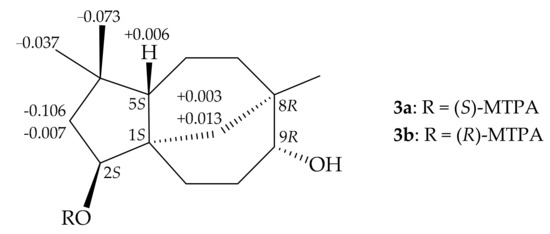 Compound 3 was identified by comparison of its spectroscopic data with those of clovane-2β,9α-diol, which had been previously isolated from terrestrial plants Dipterocarpus pilosus [34], Salvia canariensis [35], Viguiera excelsa [36], Viguiera linearis [37], and Sindora sumatrana [38]. This was the first occasion in which this metabolite was obtained from a marine source. Clovane 3 was treated with (R)-(–)- and (S)-(+)-MTPA chloride to yield (S)- and (R)-MTPA esters 3a and 3b, respectively. A comparison of the 1H NMR chemical shifts of 3a and 3b (Δδ values shown in Figure 4) led to the assignment of the S-configuration at C-2 (Supplementary Materials, Figures S15–S16). Therefore, the absolute configurations of the stereogenic centers of 3 were determined as (1S,2S,5S,8R,9R).